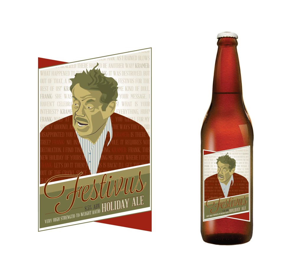 beer labels designed to celebrate small run of Seinfeld inspired holiday ale by independent brewer. illustration, indesign. (four color, various sizes scaled to fit bottle size)